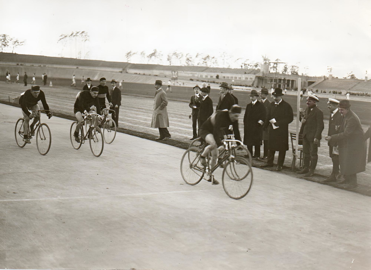 Zieleinlauf beim Bahnrennen 1920 auf der 600-Meter-Bahn die an jener Stelle lag wo sich heute das Olympiastadion befindet.